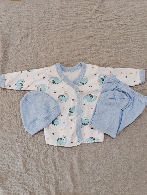 Ajuar de algodón; incluye batita, ranita y gorrito.